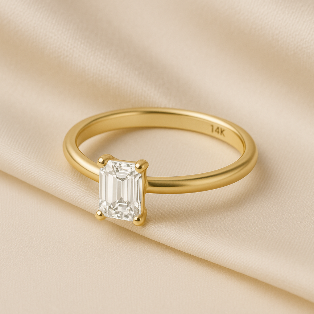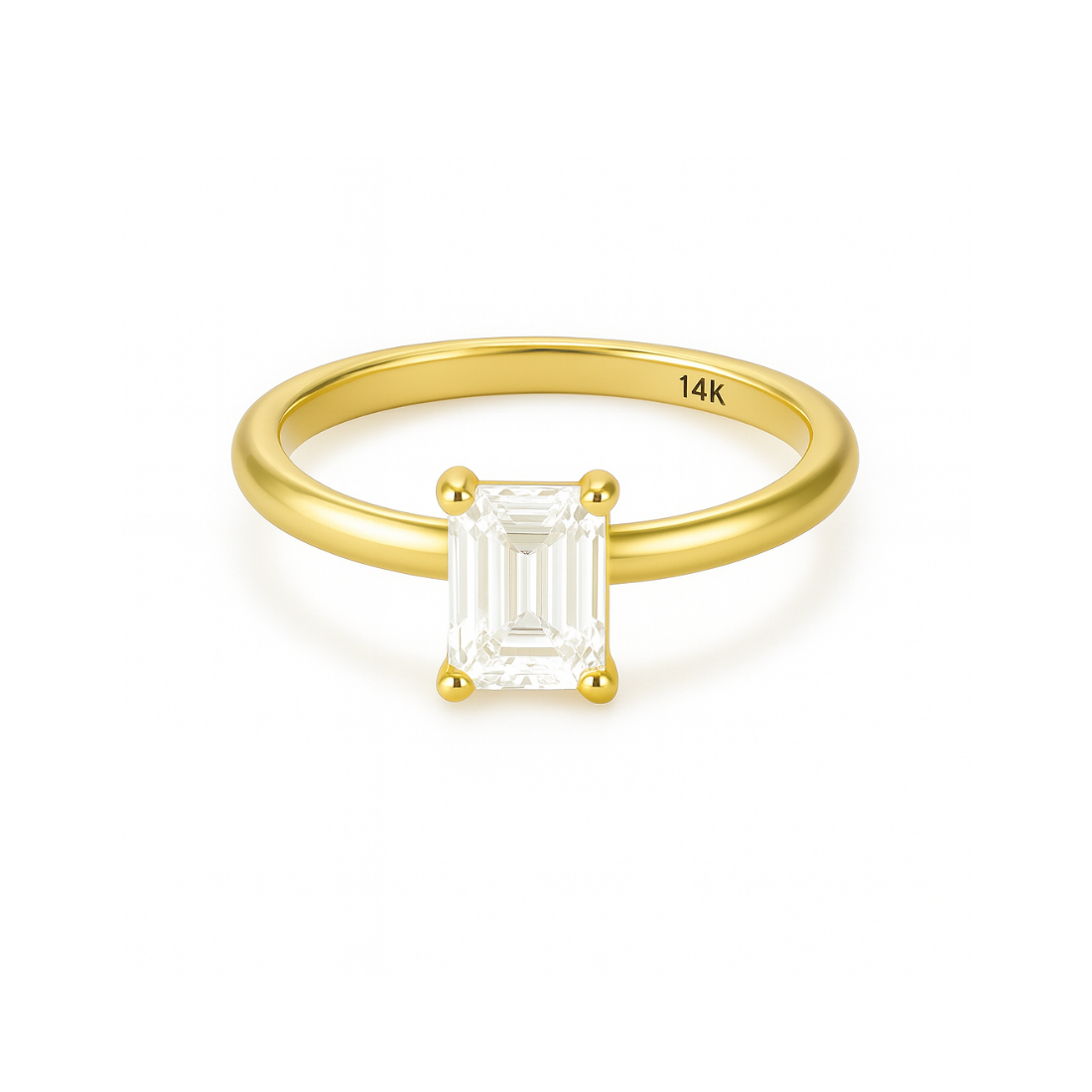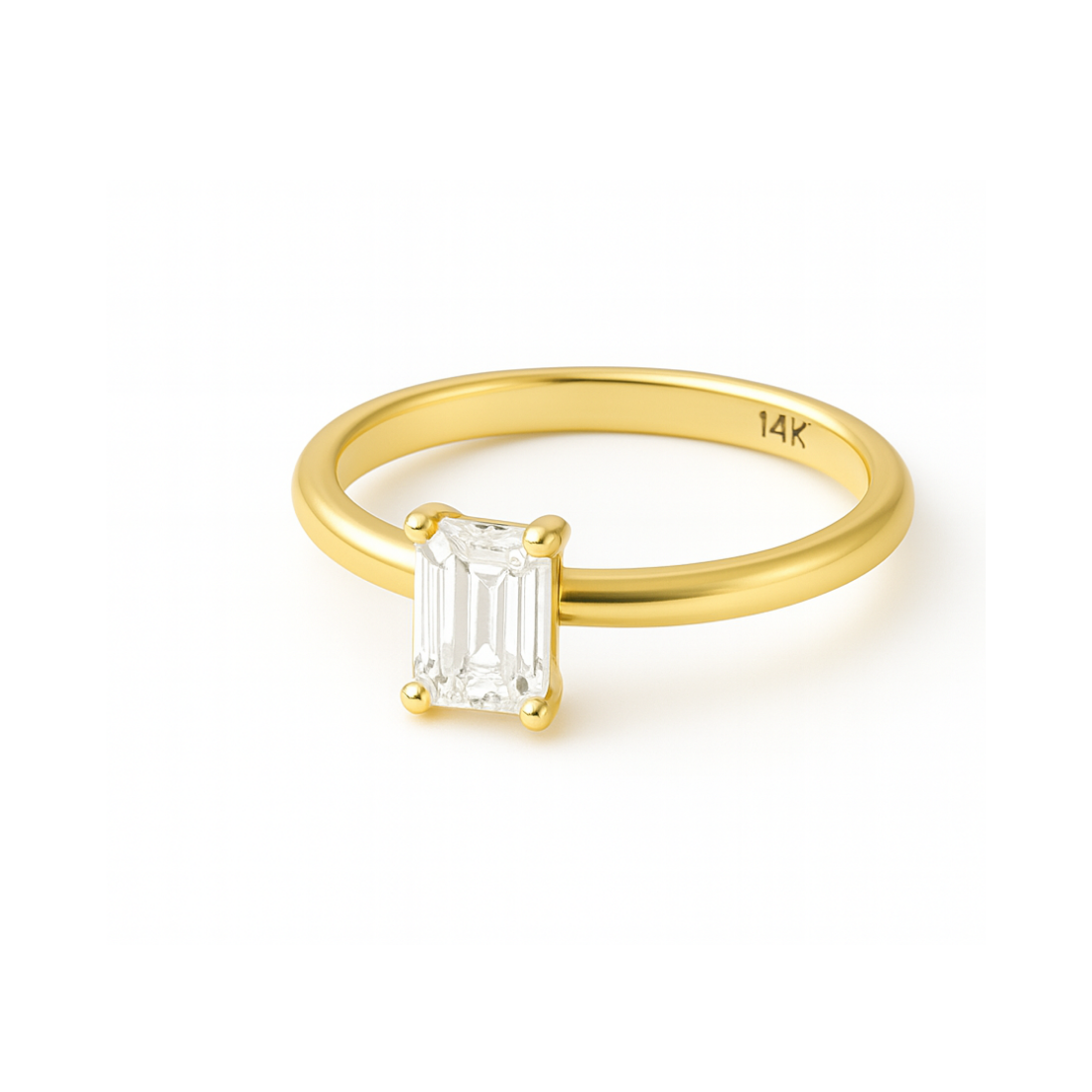 Zarif tasarımıyla dikkat çeken bu 14 ayar altın baget tektaş yüzük, dikdörtgen kesim pırlanta görünümlü taşıyla ışıltılı bir şıklık sunar. Günlük kullanım ve özel davetler için ideal bir seçimdir.