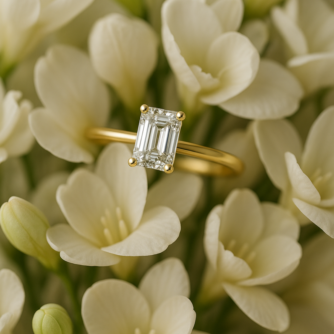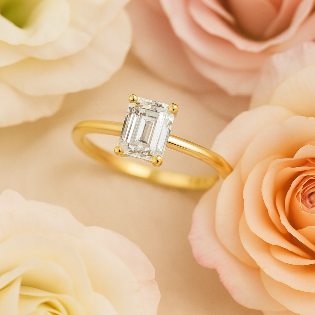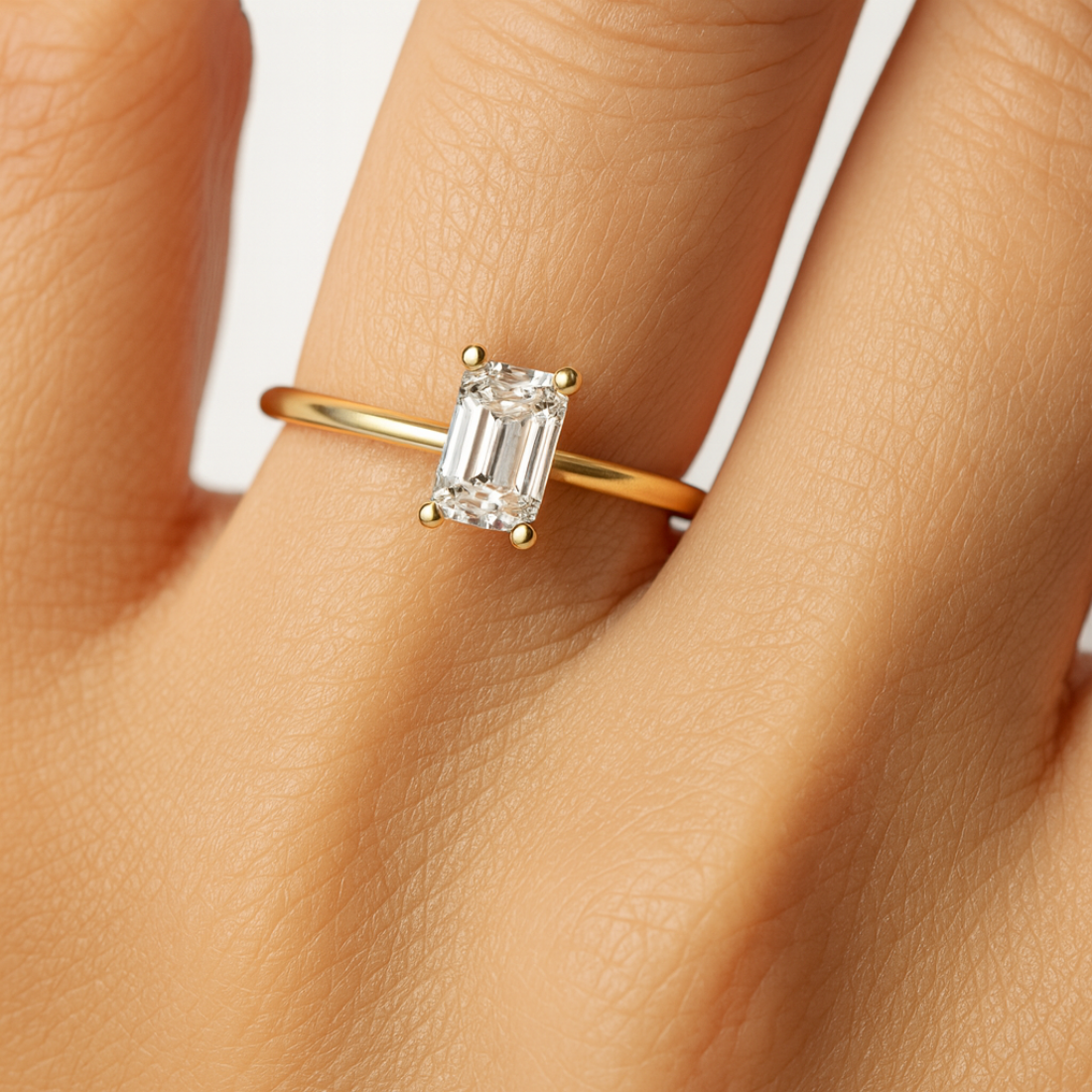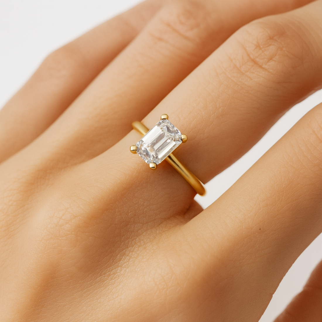 Zarif tasarımıyla dikkat çeken bu 14 ayar altın baget tektaş yüzük, dikdörtgen kesim pırlanta görünümlü taşıyla ışıltılı bir şıklık sunar. Günlük kullanım ve özel davetler için ideal bir seçimdir.