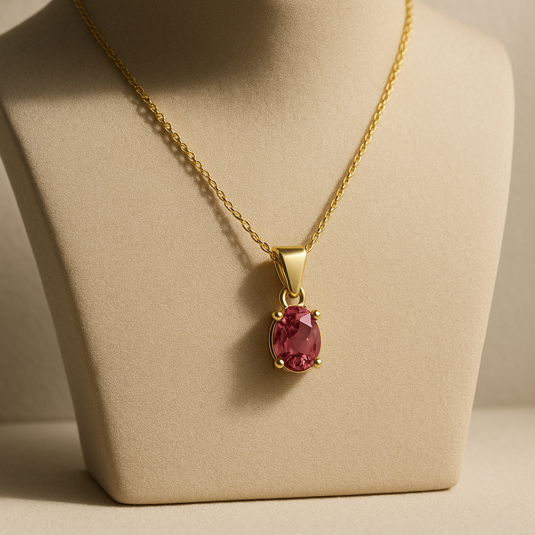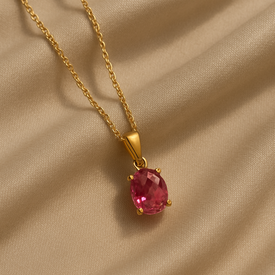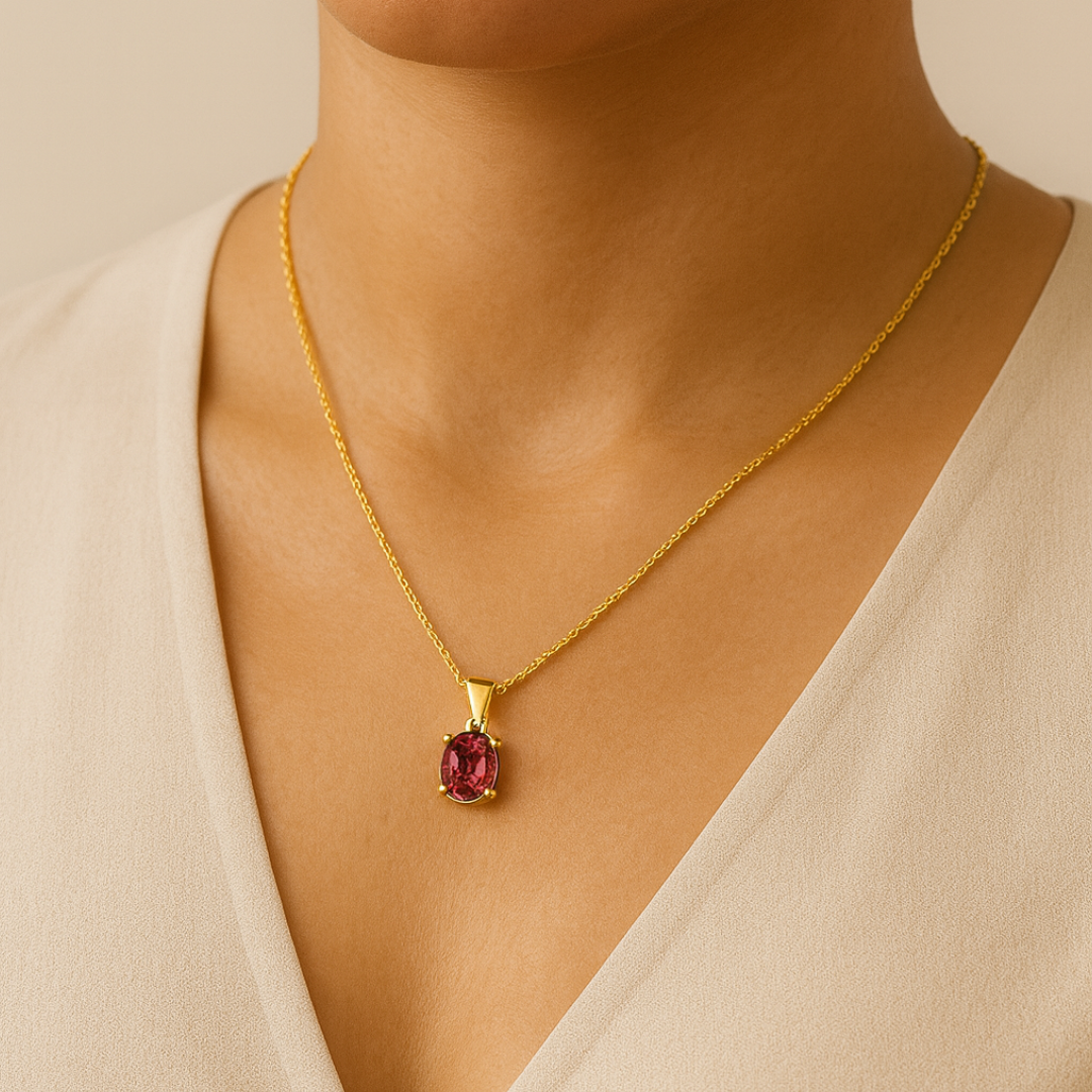 14 Ayar Altın Doğal Pembe Turmalin Tektaş Zincir Kolye