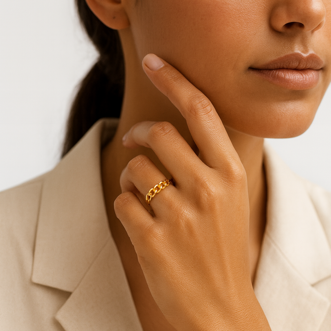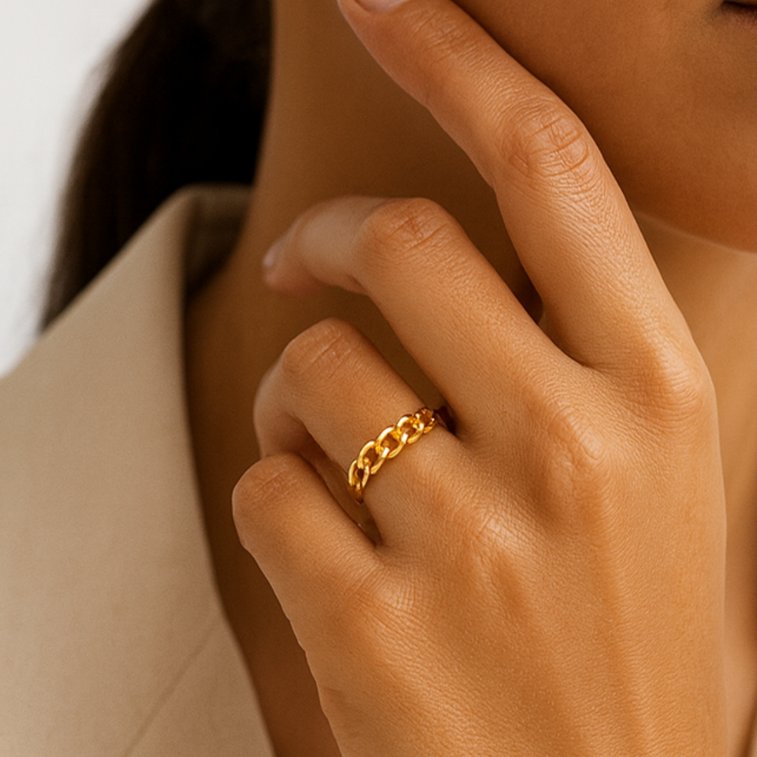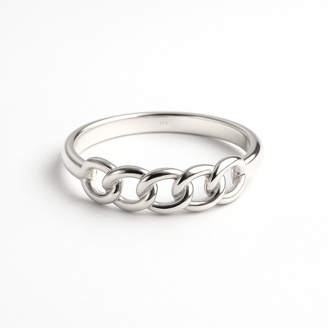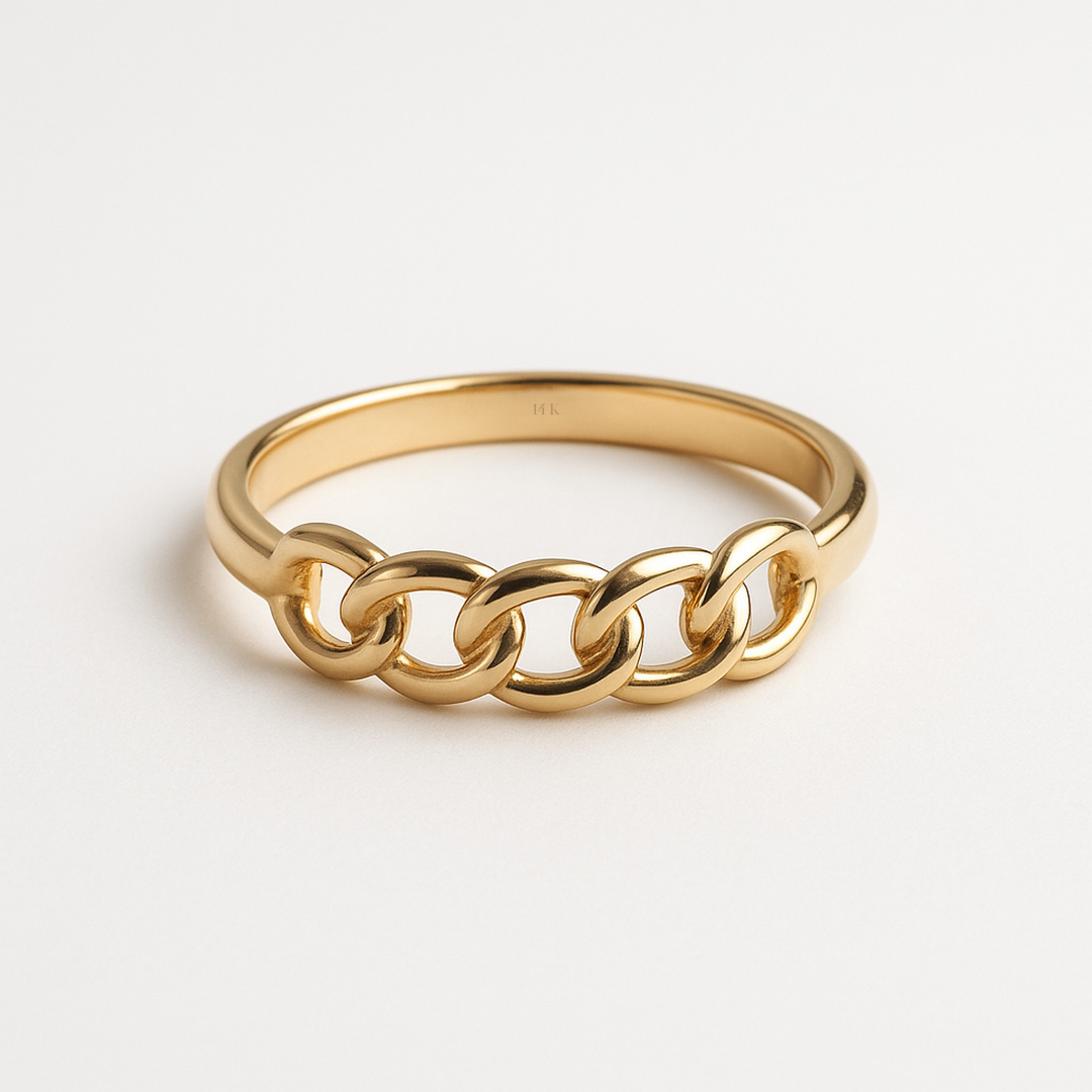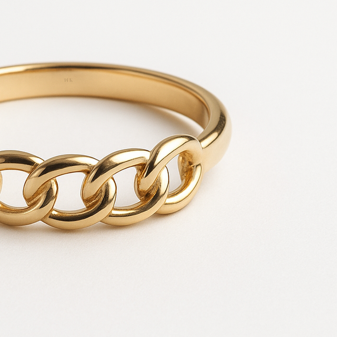 Kairos’un zarif tasarımıyla birleşen bu 14 ayar altın zincir yüzük, modern çizgisi ve kalın halkalı formuyla dikkat çeker. Günlük şıklığınızdan özel davetlere kadar her stile uyum sağlar. El işçiliğiyle üretilmiştir, parlaklığını uzun yıllar korur.