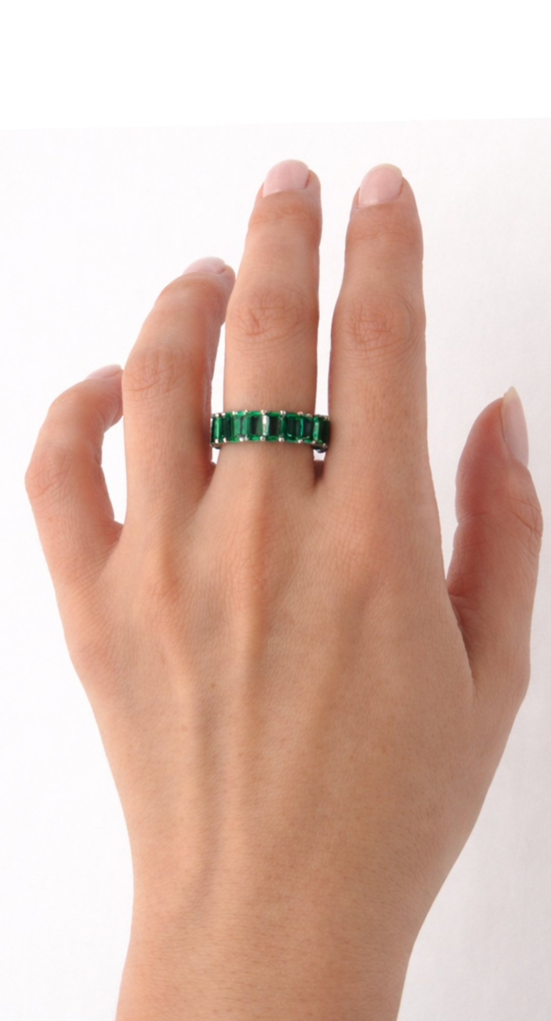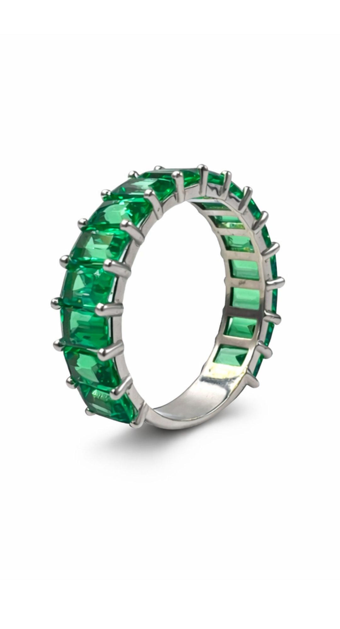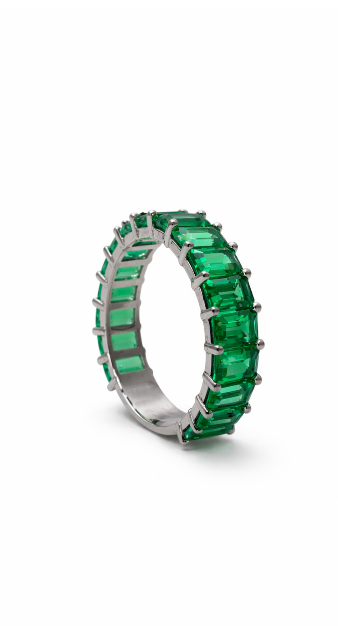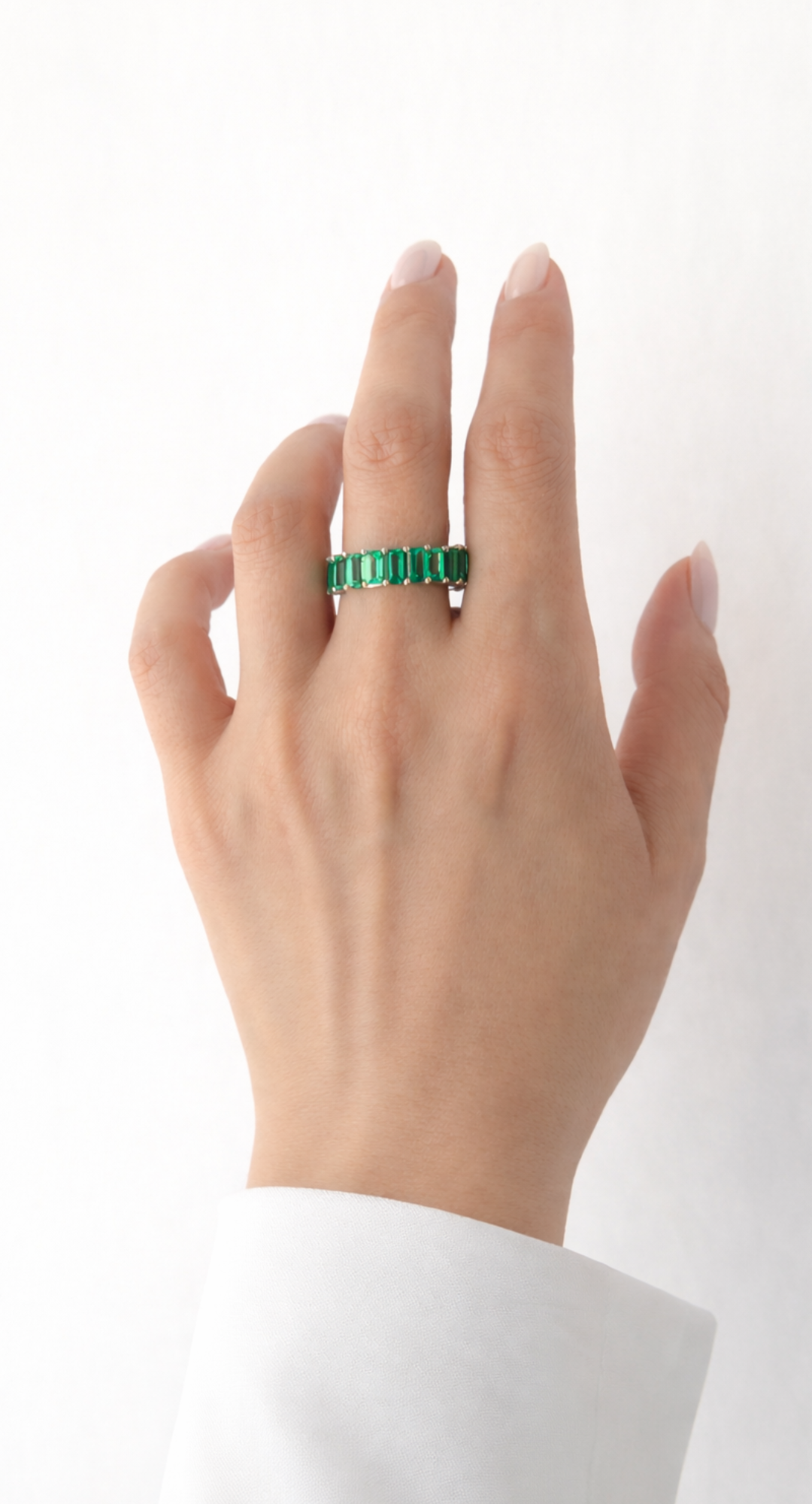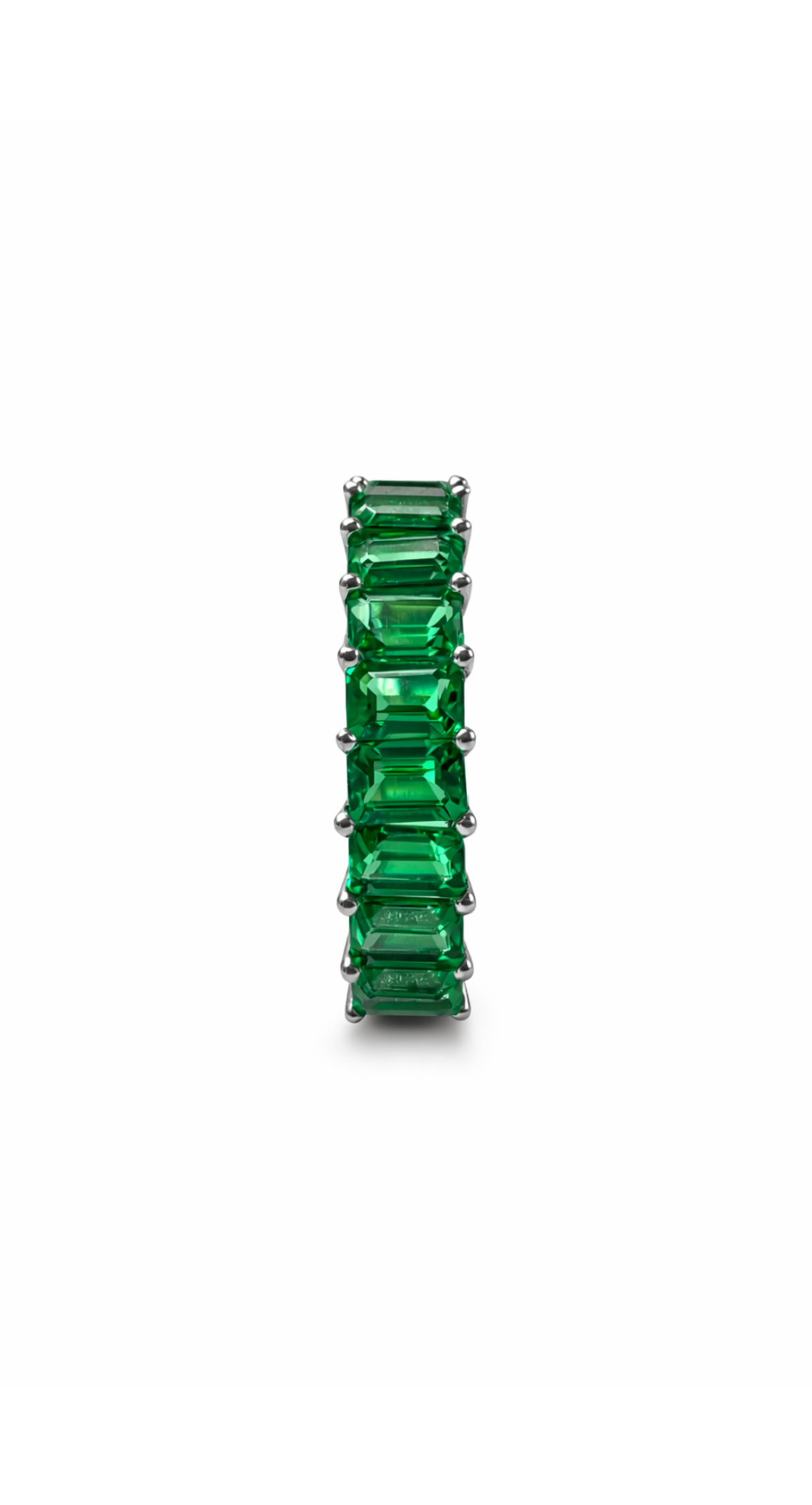 Taş Bilgisi: Bu modelde kullanılan taşlar laboratuvar ortamında üretilmiş zümrüttür (Lab Grown Emerald). Doğal zümrüt ile aynı kimyasal ve optik özelliklere sahip olup, kontrollü koşullarda üretilmiştir. Yüksek berraklık ve canlı renk tonu sayesinde estetik olarak güçlü ve sürdürülebilir bir alternatiftir.