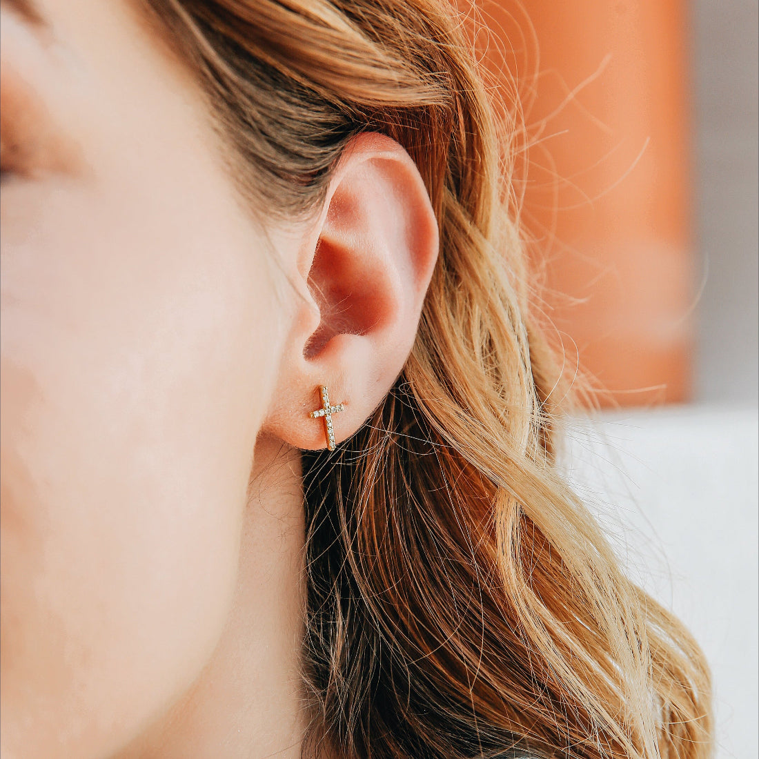 14 Ayar Altın Taşlı Haç Çivi Küpe